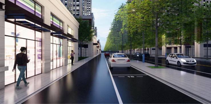 [商业街区]:运用姿态自然飘逸的朴树搭配柔软线性形态地被,营造简洁具有时尚感的空间氛围。