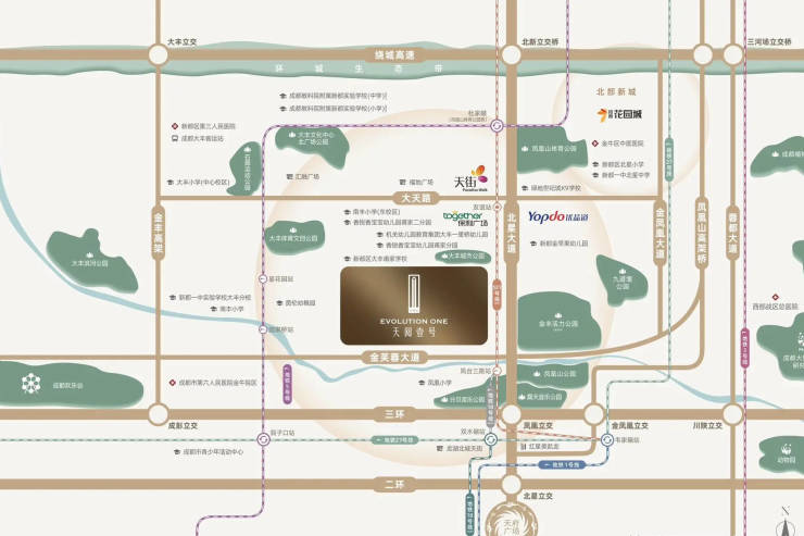 项目扼守北星大道与金芙蓉大道交汇处,作为凤凰山板块门户,兼具政务商务双重属性。东侧毗邻新都医贸大厦(年税收超亿写字楼),北靠四川省公安厅在建办公区,365亩金丰活力公园举步可达。六大公园环伺形成天然氧吧,奠定城北生态住区典范地位。