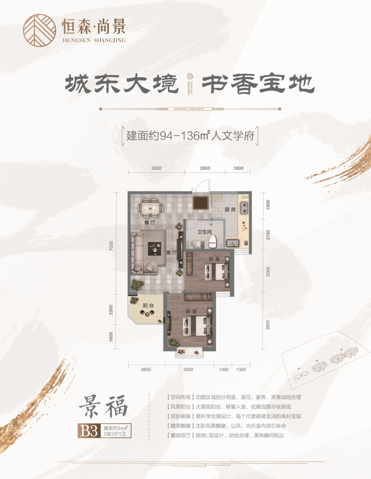 恒森·尚景位于和平成功学校对面,地处兰州“东拓”区域,交通便利。项目规划建面约94-136平米两室和三室得住宅,满足不同功能区域的兼顾。住宅内装修毛胚,车位配比1:1.2。周边生活配套成熟,生活便利。项目已售罄,敬请来电咨询。