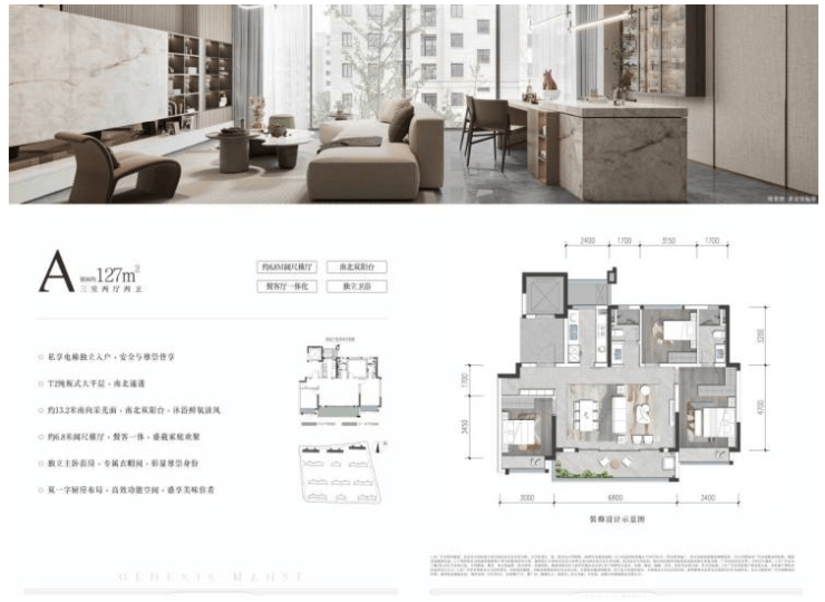 设计,将客厅、餐厅与景观阳台一体化贯通,形成了极为阔绰的家庭社交与活动空间,重构了大平层的空间尺度感,视野与采光俱佳。