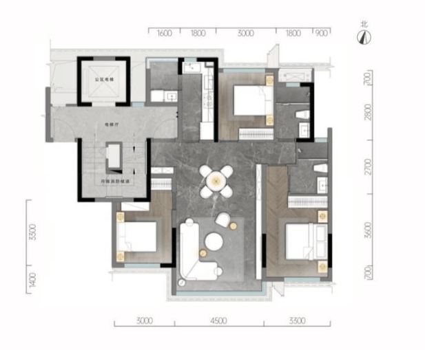 这是项目的旗舰户型,以约14%的低公摊率实现了空间价值的最大化,格局同样为奢阔的四室两厅两卫。整个户型拥有极为阔绰的起居空间和房间尺度,充分体现了高端改善住宅的从容气度。其细节标准与精工品质代表着项目的最高产品力,旨在为城市菁英阶层提供终极的居住体验。