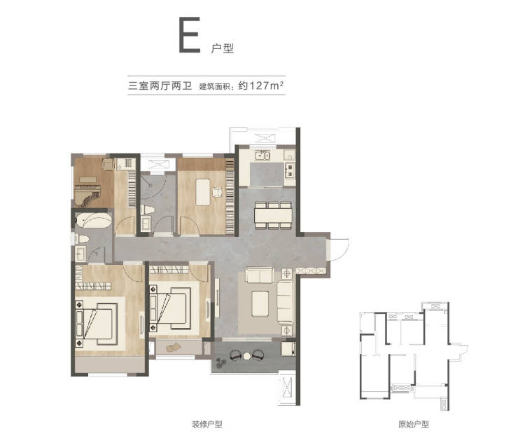 E户型:建面约127㎡(四室两厅两卫)