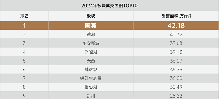 当城市向西的浪潮撞上主城回归的政策,国宾板块每一次土拍都牵动成都——保利、万科、龙湖等十余家头部房企推滩进驻。2024年成都板块成交面积排行榜中,国宾以42.18万㎡的销售面积位居榜首。