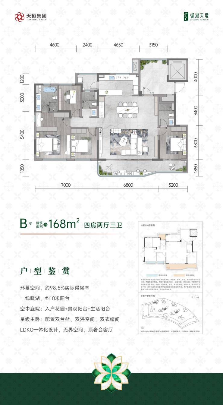 由北京天恒置业倾力打造的「天恒御湖天境」,占地61.7亩,容积率仅1.5,绿化率达30%,打造低密宜居社区。项目规划8栋住宅共220户,配备4栋商业综合体(含商业街区及星级酒店)。住宅均为11层小高层,采用2梯2户设计,公摊19%并赠送12㎡入户空间,实际得房率高达98%。