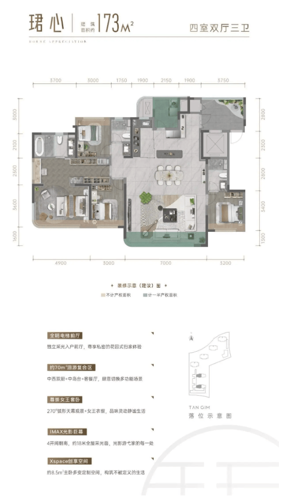 此户型是项目的巅峰之作,定位为可传承的家族资产。它拥有更为奢侈的客厅面宽与家庭公共区域,可从容规划