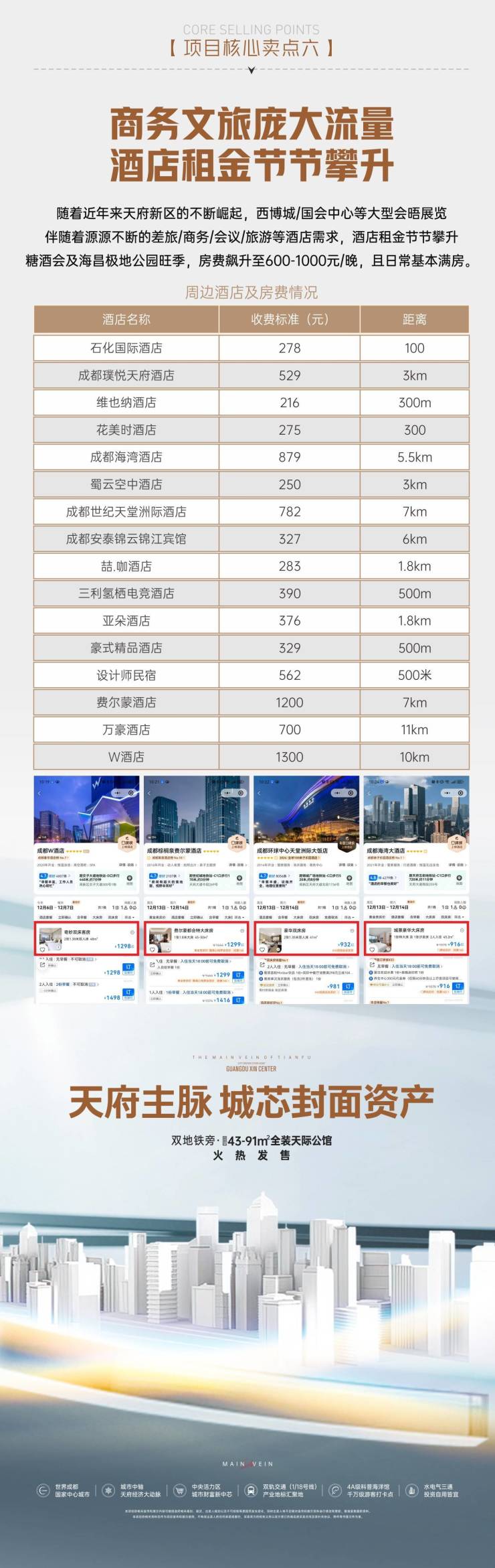 同区位同地段的石化大厦酒店(距离仅 50 米),日常酒店房费 300-400 元/晚,糖酒会及海昌极地公园旺季,房费飙升至 600 - 1000 元/晚,且日常基本满房。将公寓打造成民宿,收益同样十分诱人。