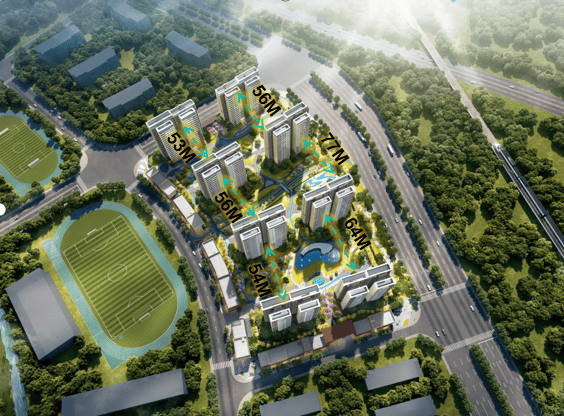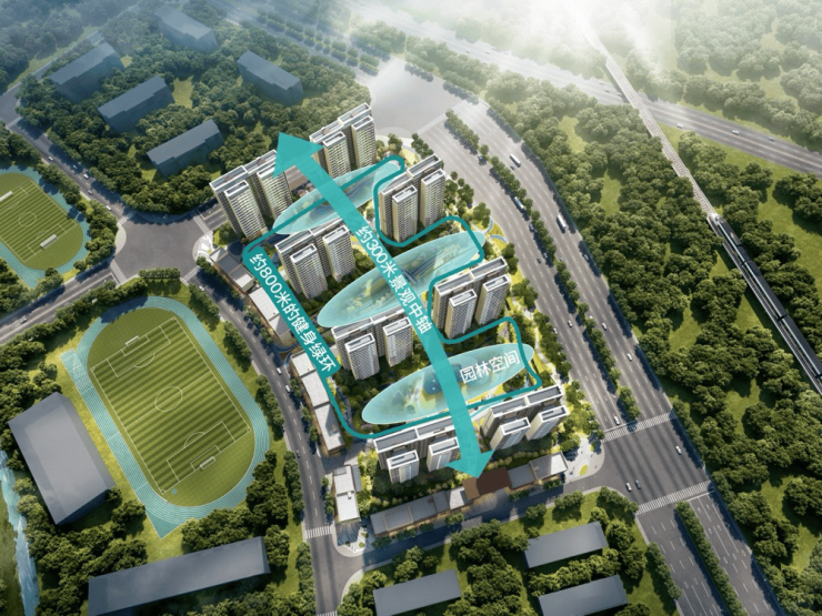 三大主题园林:300米景观中轴+800米健身环道+三大中庭花园