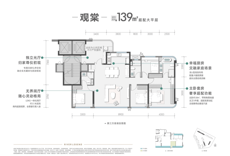 该户型以约17.4米超宽视野面打破空间界限,实现室内外景致交融。创新设计的超级大方厅配合270度采光主卧套房,重塑高端居住体验。特别值得关注的是7层纯洋房产品,独享一线清水河岸线资源。6.8米河景客厅、4.5米主卧套房、3.3米次卧套房及近10平方米空中院馆均面向清水河布局,让日常起居与自然景致相得益彰。
