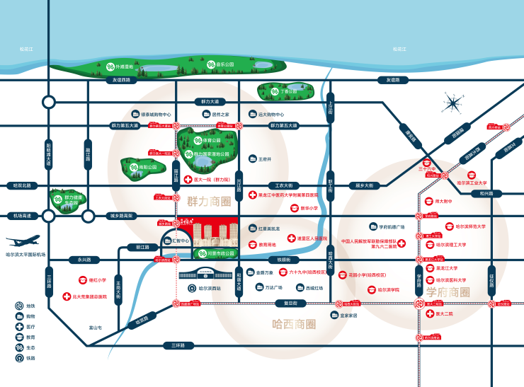 5公里生活半径涵盖哈西万达、群力金中环、学府凯德三大商圈,优享红星美凯龙、汇智广场、哈西万达、西城红场、王府井、学府凯德、哈西服装城等繁华商业;哈医大二院、道里区人民医院、医大一院群力分院健康护航;城央繁华,璀璨尽享。