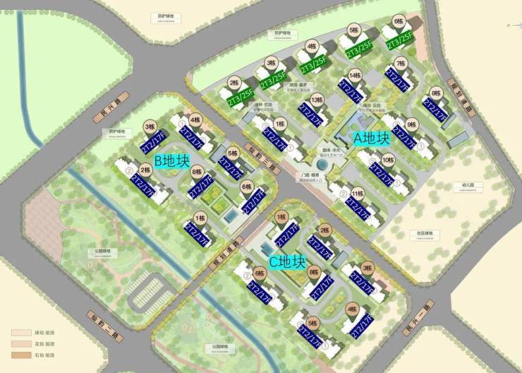 B地块和C地块则被规划道路、仙韵三路和二仙桥公园围合,均采用围合式布局,7栋2T2/17F的小高层分别朝向中庭景观或公园景观。