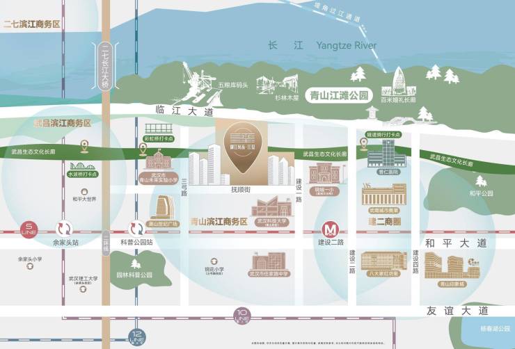 110万方武汉最美江滩+18公里世界级城市绿道前有被誉为“武汉最美江滩”的青山江滩,紧邻武九铁路遗址公园、市级园林科学公园。