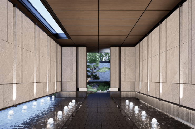 在约80米宽的门庭入口,直接开启的大隐于世的隐奢儫门格调。多种奢石奢材的铺装,以造型纹理结合匠心工艺,营造出肉眼可见的隐奢质感与幽静氛围。大面积爱马仕宝石系大理石镶入冷峻灰不锈钢包边组成的景墙,低调但又质感十足。入口两侧由沉稳灰色大理石到白色冰裂纹陶板墙面,由石头到陶片,象征着渐入佳境,风雅自生。两侧对称而立的造景松,都是从泰山整株移植而来。