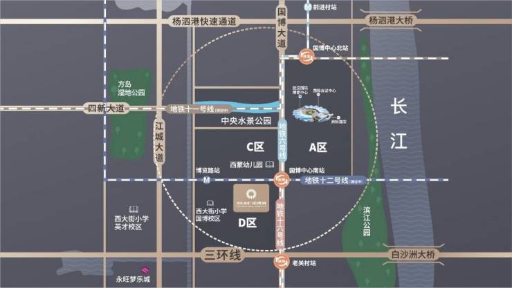 【项目位置】汉阳四新南路与鄂渚路交汇处【产品】2栋17-18层小高层,10栋22-33层高层【产权年限】70年【交房标准】毛坯【绿地率】30%【容积率】2.16【公摊】约16.5%-21%【交通配套】近临博览路地铁口,6/16号线已开通,11号线四期规划中,12号线火热建设中【商业配套】汉阳山姆会员旗舰店、中百超市、麦当劳、肯德基等全业态商业已落地国博城,近享永旺梦乐城、万达广场【生态配套】运动公园、口袋公园环绕,自带社区景观园林————————————————————
