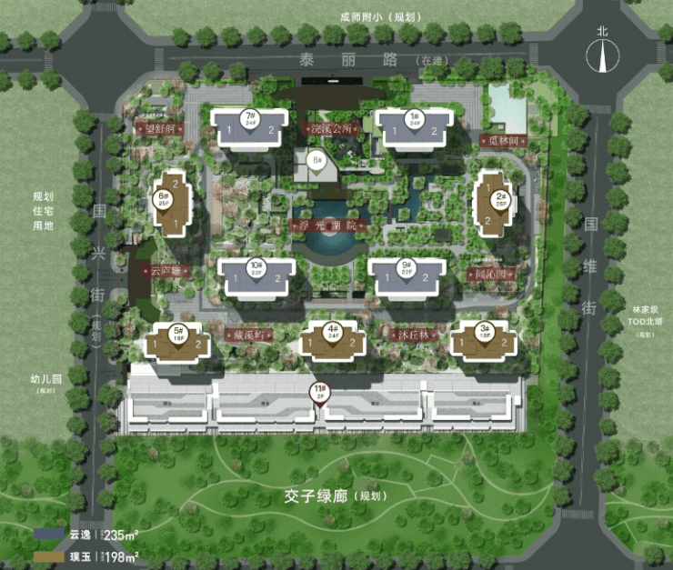 项目总占地约52亩,容积率2.5,商业占比5%,绿地率高达35%。为打造极致居住体验,开发商突破常规规划:将原17层住宅调整为18-25层高层建筑,通过优化楼栋布局,不仅降低了建筑密度,更实现了更开阔的楼间距,充分满足高端住宅对私密性与舒适度的严苛要求。