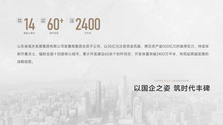 国匠精工,与城共生。入主冰城15载、依托鲁商集团强大国企背书、深度参与城市心脏位置运营,打造多座口碑品质楼盘。2025鲁商从改善城市生活回归豪宅赛道,为城市厚植人文基因,再筑隐奢新作。