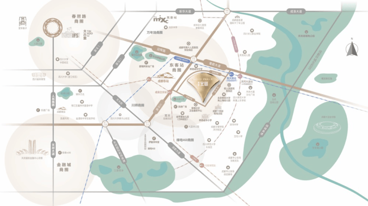 项目位于和韵西路 39 号,毗邻三环路、成渝立交等主干道,地铁 2 号线成渝立交站距项目仅 1 公里,规划中的 20 号线未来将进一步提升交通便利性。周边 1 公里范围内汇聚树德小学、树德中学等优质教育资源,省人民医院东院(三甲)、凯德广场、万象城等医疗商业配套环伺,形成 15 分钟全维生活圈。