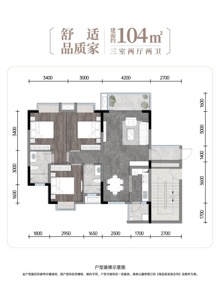 104㎡三室两厅两卫户型,户型方正,动静分区明显