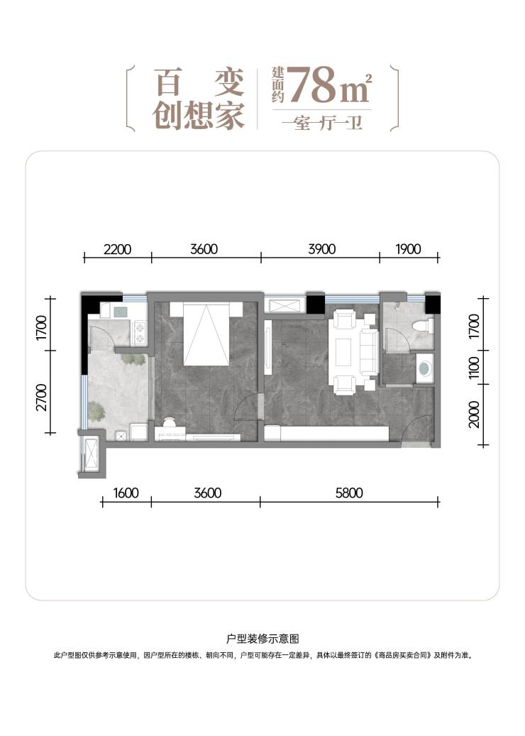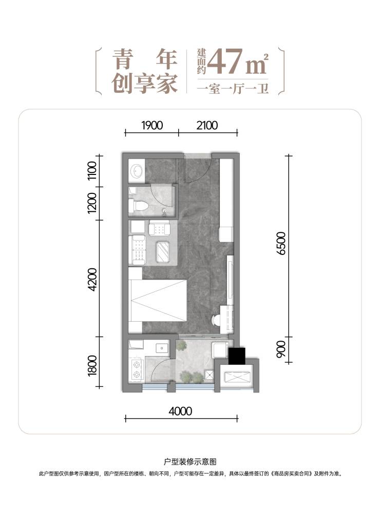 在本市在售一室户型中面积较大,且为标准层高设计,能带来较为舒适的空间感受