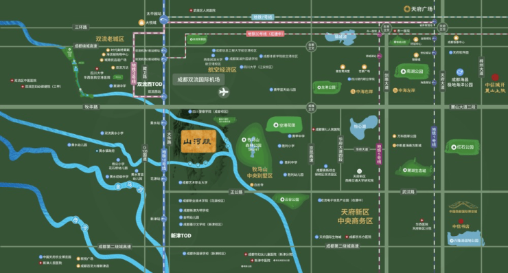 坐落于天府新区与双流区交汇处的山河赋,占据成都"南拓"战略核心区位,既享有国家级新区的发展红利,又坐拥双流国际空港的交通优势。