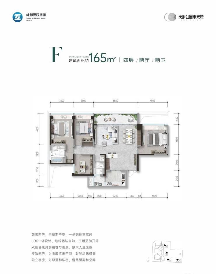 由成都天投地产开发有限公司倾力打造的【天府公园未来城】,坐落于天府中央商务区核心区位。项目总占地120亩,分为南北两个地块(南地块63亩/北地块57亩),规划建设11栋高层住宅,共计933户。主力户型为165-214平米的四居室,层高3.1米,采用2梯2户和2梯4户的配置。