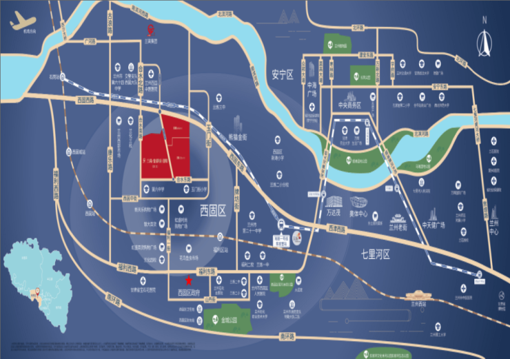 4.医疗:三公里范围内有宝石花医院(三甲)、西固区人民医院、兰化医院、西固中医院、西固区妇幼保健院、兰炼医院等多所医疗资源配套,驾车最多仅需5分钟即可到达。项目2公里左右有宝石花医院(兰石总院),是西固区唯一一家综合性三甲级医院。多所医疗资源为健康保驾护航。