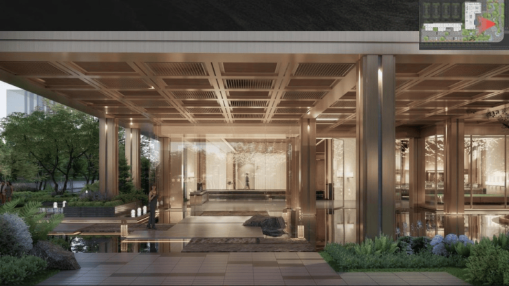 项目一期打造双轴六苑的景观设计,以东西向归家主轴和南北向生活次轴形成六苑的景观设计,归家主轴以小区门厅组团的森泊之门苑,林溪客厅苑,自然营地苑,水榭会所苑组成,生活次轴以青樾广场苑,绿谷街区苑组成。