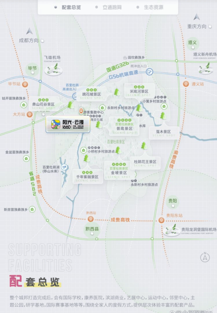 【阳光云漫1660】是由阳光大地集团和百里杜鹃合作打造的大型康养旅游度假区。项目占地约12000亩,其中约8000余亩为主题景区和公建配套设施,约4000余亩为旅游康养度假社区。