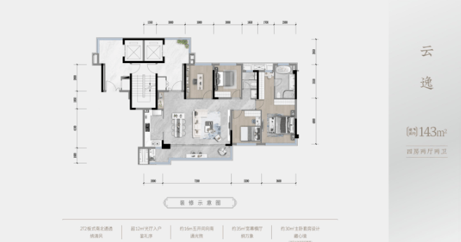 作为高层平层主力,此户型定位为都市核心家庭的终极平层改善。四房两厅的配置确保功能完备,宽境设计则强调空间的尺度感与通透性,横厅布局能最大化引入光线与景观,满足高品质的日常居住与家庭社交。