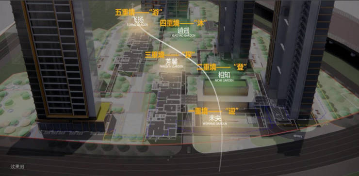 中央驿站聚合藏宝阁、城市花园、物流驿站、下沉式社区聚院等多功能体验空间