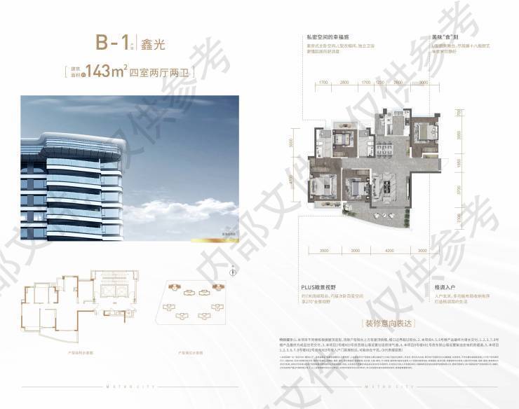 B-1建面约143平米主流户型:拥有约7米的阔绰阳台,具备270°全景视野。套房式主卧空间,搭配L型衣帽间和独立卫浴,尽显舒适与品质感。