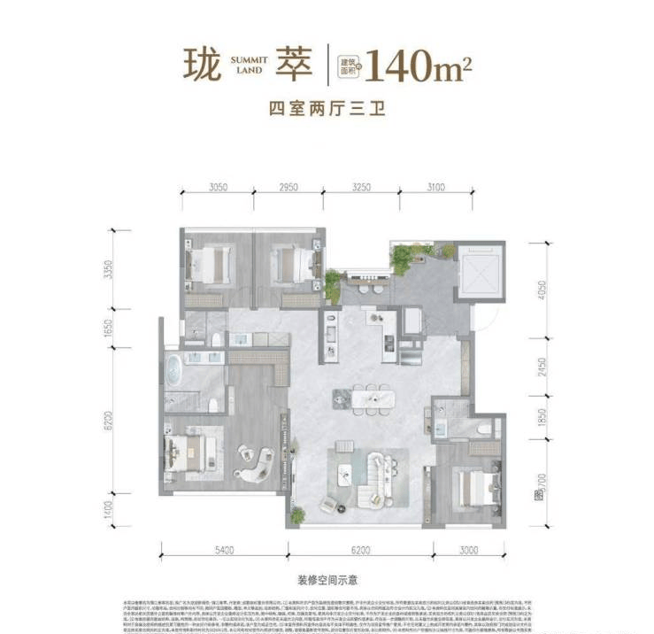 建面约140㎡的四房:实际使用感受可以媲美市面上传统的160-170㎡大平层。