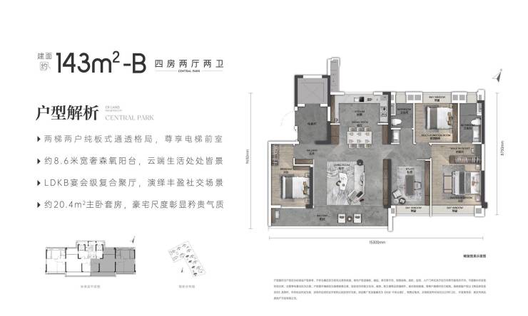两梯两户尊享电梯前室/约8.6m阳台/LDKB一体化宴会厅/约20.4㎡多功能主卧套房