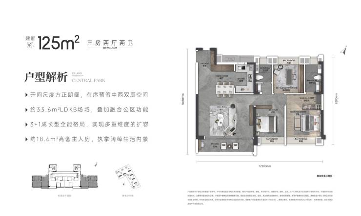 约33.6㎡LDKB一体化聚厅/预留中西双厨岛台/约18.6㎡高奢主卧套房