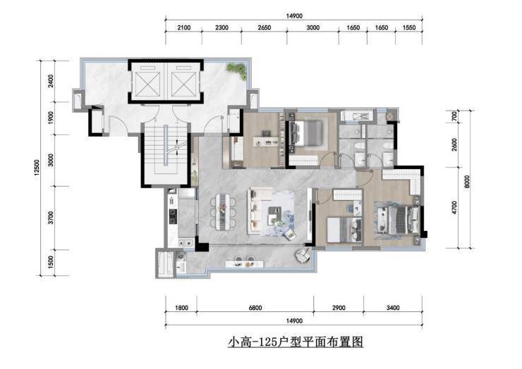 建筑面积范围:125-143㎡的宽境四居平层,190-210㎡的城芯叠居别墅