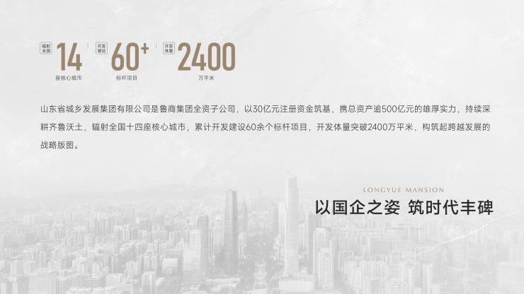 国匠精工,与城共生。入主冰城15载、依托鲁商集团强大国企背书、深度参与城市心脏位置运营,打造多座口碑品质楼盘。2025鲁商从改善城市生活回归豪宅赛道,为城市厚植人文基因,再筑隐奢新作。