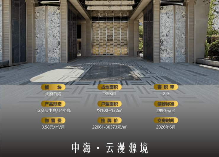 中海云缦源境属于中高端改善型住宅项目,定位为天府新区的高品质居住社区,主打低密度、精装交付和改善型需求,总价区间集中在220-320万元/套,适合追求舒适居住环境的城南改善型购房者。