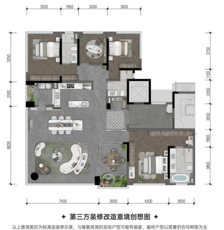 四室两厅两卫,独立电梯厅入户;7米客厅面宽,动静分区;赠送空中院落。