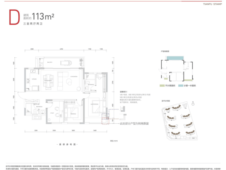 户型设计亮点突出:97㎡实现三房两厅双卫全能布局;9.8米南向面宽,三面采光确保通透性;3.6米客厅与3.3米主卧尺度考究;主卧及书房配备0.7米进深飘窗,拓展实用空间。