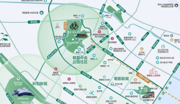 项目位于郫都区无可复制的核心地段,不仅被规划中的约500亩望丛中央公园三面环抱,更串联起古蜀文明发祥地望丛祠与代表未来的成都科幻馆,形成了“一轴串双核,一园望古今”的独特格局。这里既是城市的文化绿肺,也是郫都未来发展的价值高地。