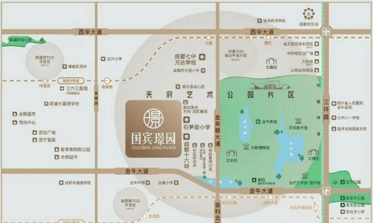 路网:金牛大道+西华大道双主干道,金粮路/金芙蓉大道/三环路形成三纵