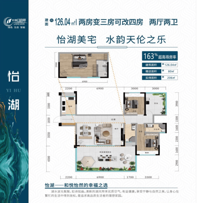 精品户型推荐二——两梯三户,建面约126㎡ 赠送80㎡,可拓展3+N户型 163%得房率