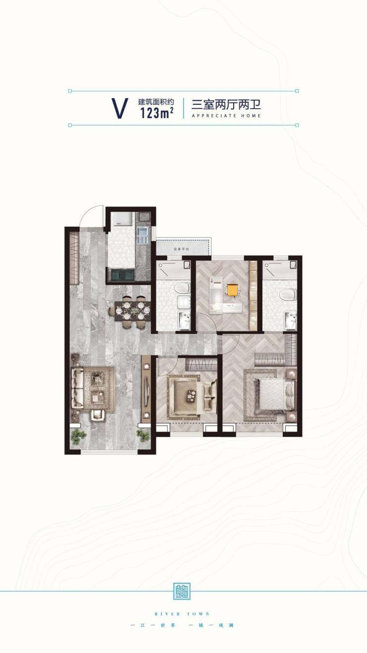 【在售产品】建筑面积约89米,两室观江南北通透;建筑面积约109米,三室单卫观江南北通透;建筑面积约123米,三室双卫观江南北通透