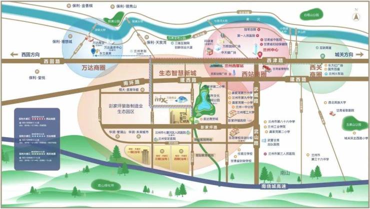 交通:四横六纵交通路网,速抵全城,四横:西津路,南环路,龚家坪西路及南绕城高速;六纵:S202、B204、S261、B210、S212、T218,项目距西津西路实际距离约7公里,畅达西固、安宁、城关三区。西客站下穿隧道现已开通,北接西津西路,南接南山路,南北贯通,极大地缩短了彭家坪与西津西路的距离,使交通路网更畅达。