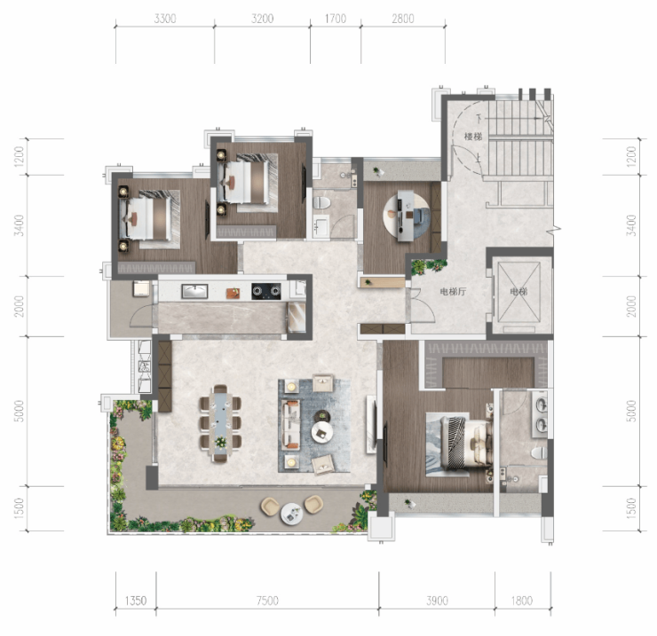 中庭尊位,闼境横厅+空中阳台,尽享量身定制的敵闼横厅;L型转角空中观景台,于花园正央,约3万㎡i至美佳境揽景入怀;宽敞入户空间,拓宽生活舒适度,让居家动线更加静谧、安全开放式明厨设计,无缝衔接闼尺餐厅,各式欢聚场景从容应对; LDKB双洞游动线,尊贵生活自在有序,家人、朋友随时在家从容欢聚;行政主卧套房,专属衣帽间、卫生间配置,让宽境生活尽享每一处。