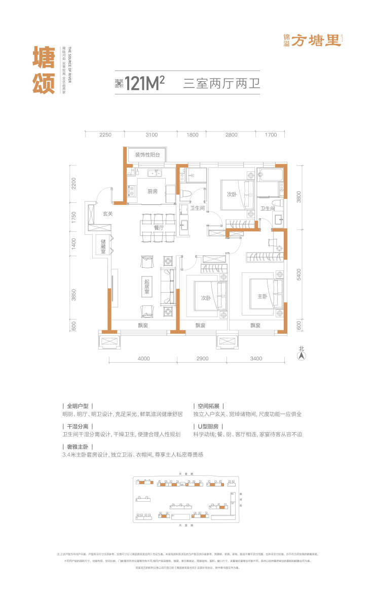 【建面约121㎡ 】 改善家庭样板 同等配置 空间更阔绰!全明格局+主卧贯通式设计(南北通透设计),舒适从容;四大收纳系统,储物更强(玄关、走廊两大储物、主卧衣帽间、储藏室)。