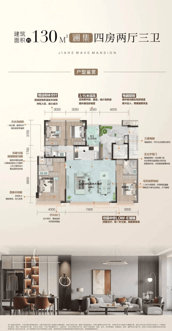 此户型是舒适性改善的主力,在功能完备的基础上,显著提升了各个空间的尺度感。通常采用约7.4米面宽的豪华横厅设计,连接超大景观阳台,公共区域极为开阔。主卧升级为套房设计,并配备独立衣帽间和卫浴,私密性与舒适度大幅提升。