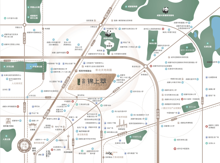 生态医疗环绕:坐拥沙河公园、驷马桥公园、海滨公园等城市绿肺环伺。短程车程内即可抵达华西医院(本部)、成都大学附属医院等多家三甲医院,守护家人健康。