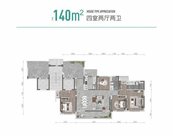- **建面约140m² 北辰星**:宽境奢阔四房,超宽楼间距中庭景观尽收眼底,双套房设计,尤其是总统主卧套房,尽显尊贵。