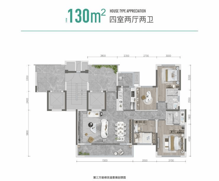 **建面约130m² 天权星**:全能进阶四房,拥有天幕花园玄关、奢阔横厅设计以及南北双阳台,满足家庭多样化需求。