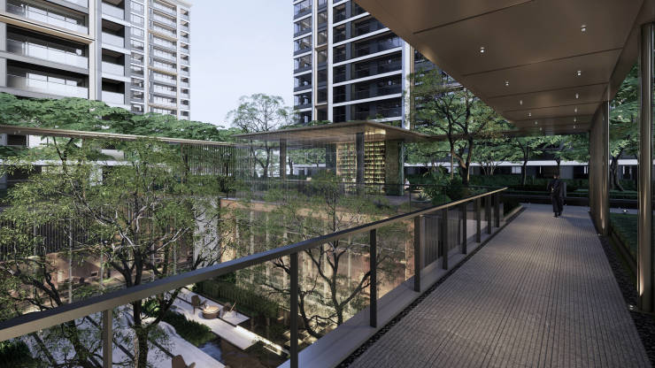 以“风雨连廊”串联社区入口与尊崇会所,配置下沉式庭院、宅间花园等空间,从地下车库的光厅,到地上精装大堂,皆呈现归家仪式感。